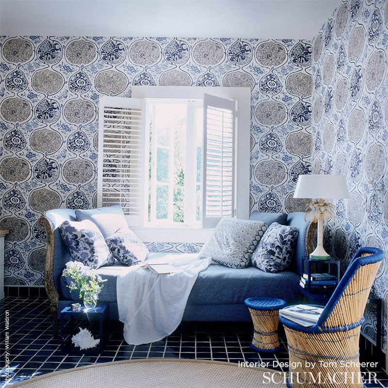 A Schumacher signature pattern, the painterly design is a whimsical nod to Japanese aesthetics and makes a unique statement. Available as a linen-cotton fabric and a wallcovering. -