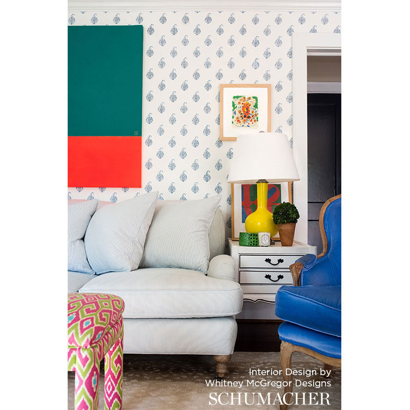 This classic tear-shaped paisley is created using a single wood block printed in a repeating half drop pattern. Each paisley is composed of floral elements and lace-like detail. -