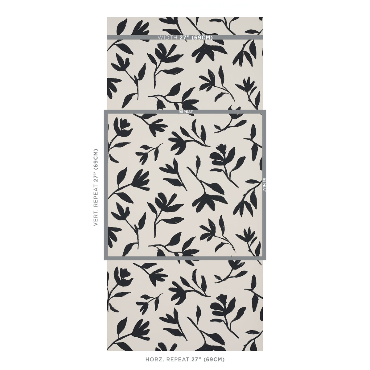 Laurel in black is a lovely loose botanical wallpaper design that features painterly, floating silhouettes of small leafy sprigs. This screen-printed allover pattern has an elegant simplicity that is at home in traditional and modern schemes. Also available as a fabric. -