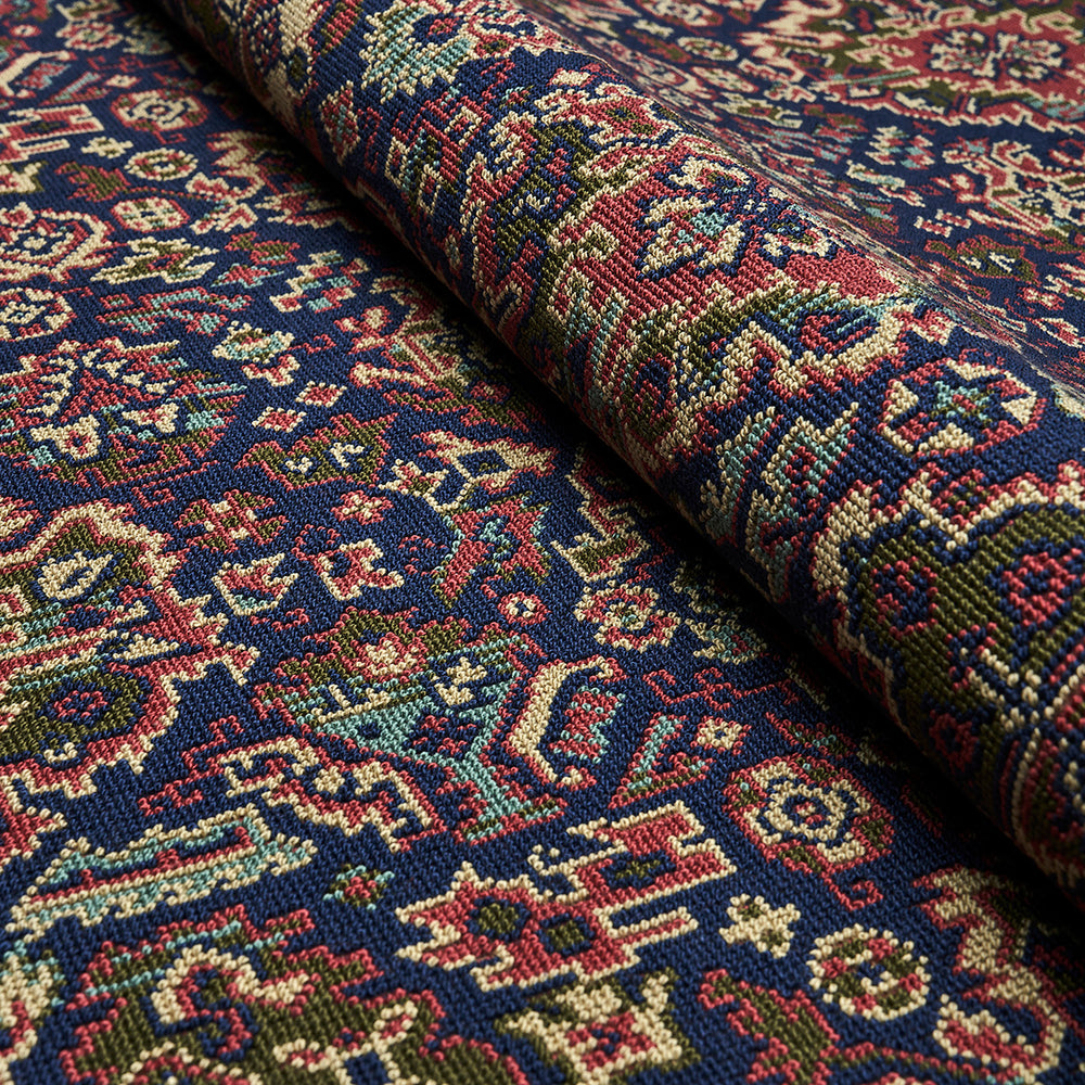 Nothing gives that old-world, put-up-your-feet look more than an antique carpet upholstered on furniture. We've made achieving it easy for you, translating traditional Oriental rug patterns into always-at-the-ready multi-colored Pallay Épinglé. This hard-wearing, luxe, upholstery-weight cotton épinglé is woven on a traditional velvet loom and will give any room a cozy elegance. -